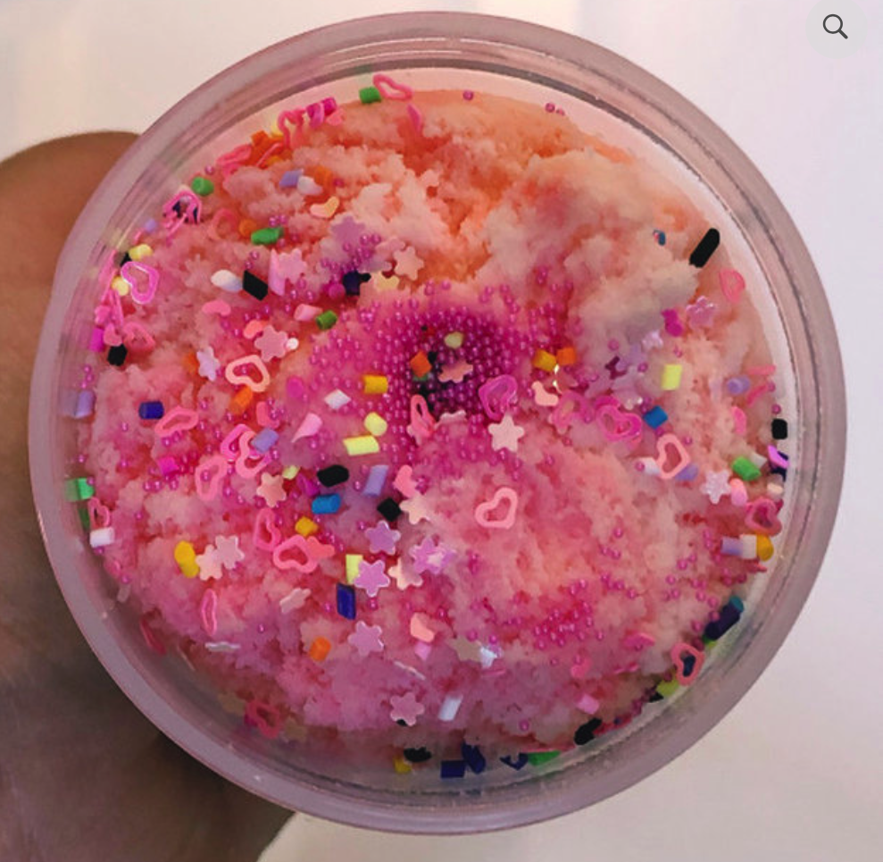 This slime is a pastel pink, medium pink, and light pink cloud slime that you get to mix yourself! It is topped with glitters, confeti, and sprinkles and has flower fimo slices at the bottom. Perfect for drizzling, strething, and all around playing with! Scented like black Cherries.