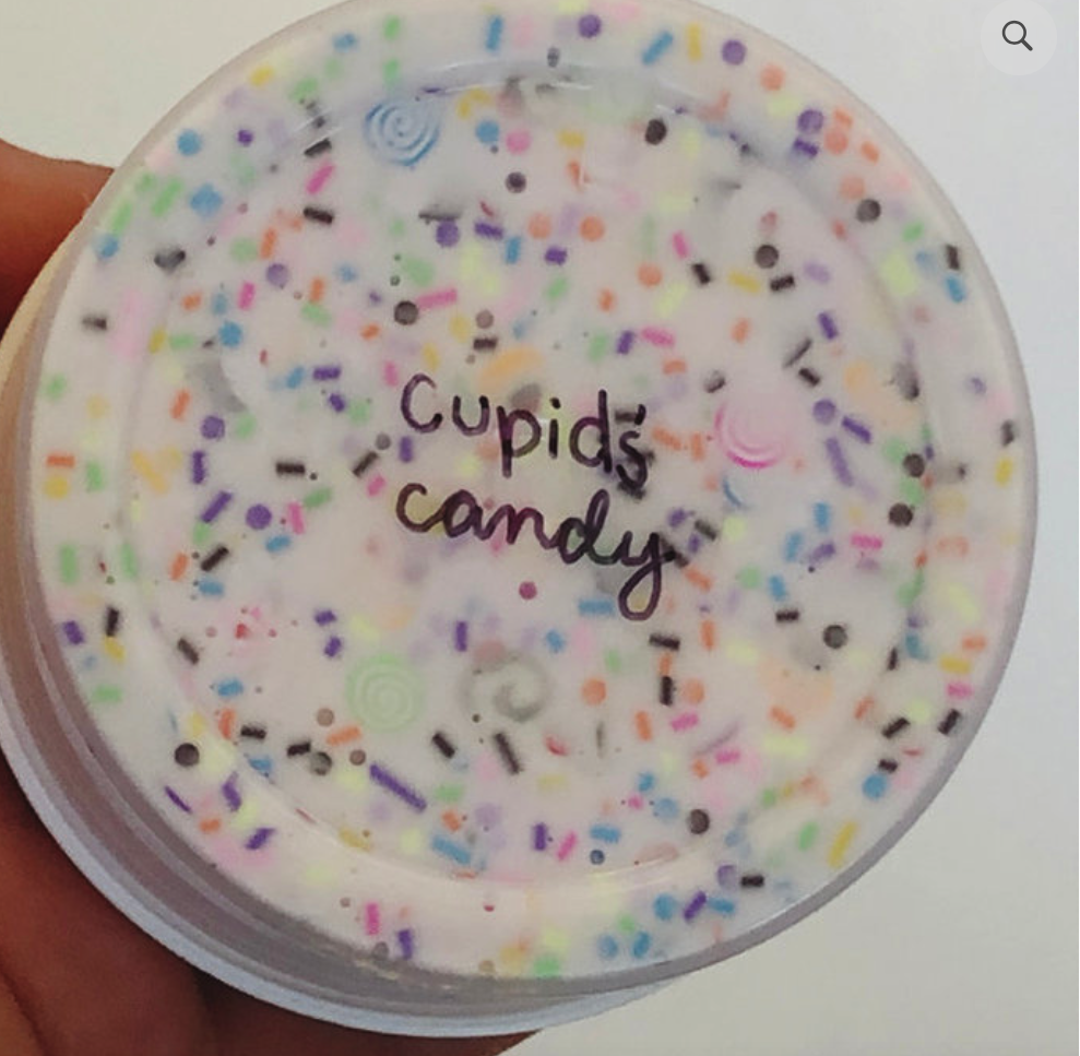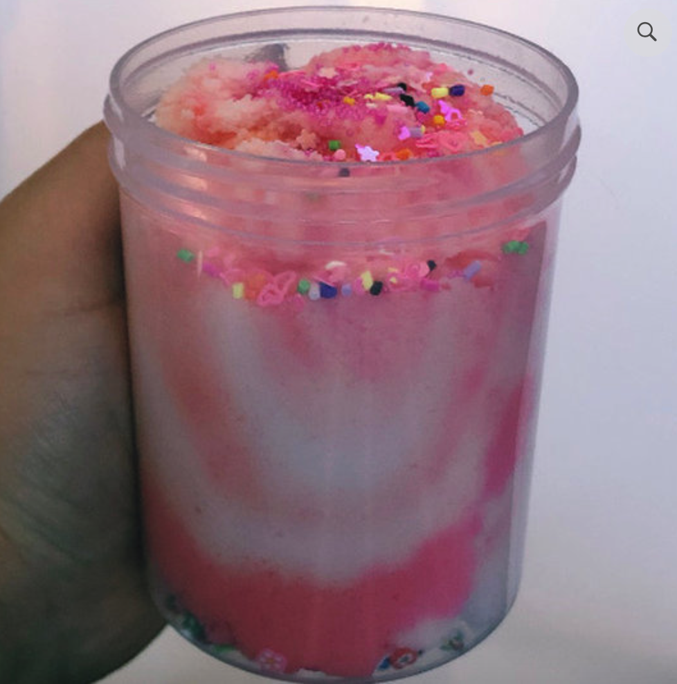 This slime is a Light pink thick and glossy slime with sprinkles and cake fimo slices at the bottom. It is super strethy, thick, and glossy.